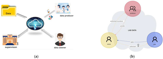 Lab data producers can be one or several persons, such as laboratory administrators, experimental instructors, or relevant teachers. A data owner is usually a person or a unit, such as a person in charge of the laboratory team or the emergency department. Data producers can input data, but they do not have the authority to share or trade data. After the data user has found targeted data by querying the DRC category, they need to contact the data owner. If the data owner considers that the data user can apply to view or use these data sources, the owner finds the user’s public key from the DAC then encrypts these data with the user’s public key to complete the authorization. The data user opens encrypted lab data with his private key to finish the conditional sharing of data (Figure 2a,b).