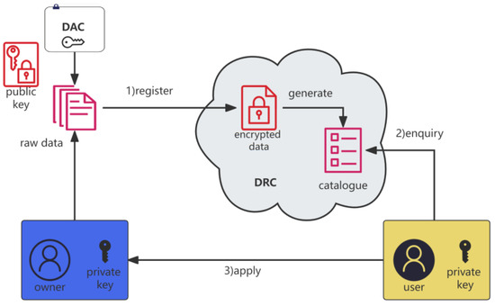 After checking the catalog in the DRC and communicating with the data owner about the data product’s price, the data user may doubt the authenticity of the data source and ownership. In this situation, the data owner will add this data product to the owner’s private key, then encrypt it by using the user’s public key, which is found in the DAC. As the next step, data owners input this encrypted data to the DRC and then inform the users.