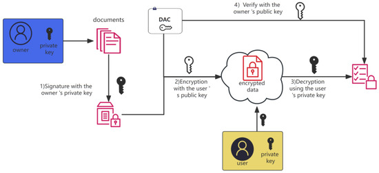 To ensure the relationship between people and data ownership, DAC is responsible for the process of data ownership confirmation and authorization [7]. By guaranteeing the interests of data owners, they are confident to put their data on the platform. The owner of the data divides data-related personnel into data owners, data producers, and data users. In the current study, a design was proposed to save all the related public keys to the DAC, and the private key is kept by their client, without placing it on any platform or cloud, to ensure security.