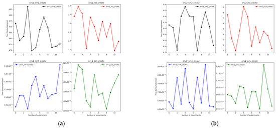 Time consumption for generating key pairs using SM2, SM4, AES, and RSA algorithms in env-1 (a) and env-2 (b).