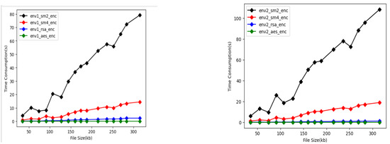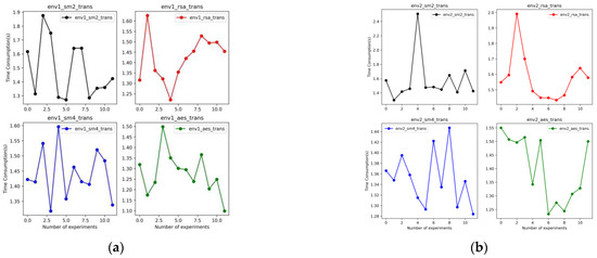 In this experiment, a key pair was generated in Chengdu, Sichuan Province, China. The public key was sent to Beijing, China (DAC). We carried out 12 experiments generating key pairs, and the tests were performed on env-1 and env-2, respectively. Figure 9 shows a speed test of the time required to generate a key pair. The results of this experiment show that using the AES algorithm is the fastest (1.232 × 10−5 s/1.605 × 10−5 s) in 2 environments. Using SM4 (3.197 × 10−5 s/6.882 × 10−5 s) to create a key pair is the second fastest, which is close to AES. Meanwhile, the SM2 algorithm is the most time-consuming way.