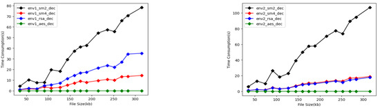 Time consumption of authorized decryption of different experimental samples using SM2, SM4, AES, and RSA in env-1 and env-2.