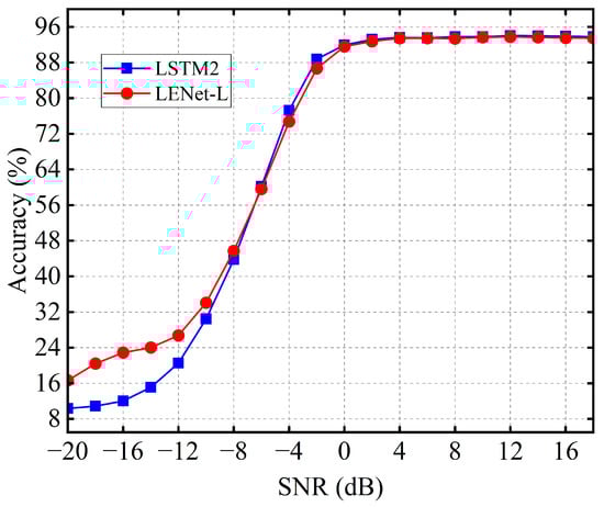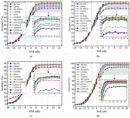 | Methods | −20 dB∼−12 dB | −10 dB∼−2 dB | 0 dB∼10 dB | 12 dB∼18 dB | All SNRs | Highest Accuary | ||||||