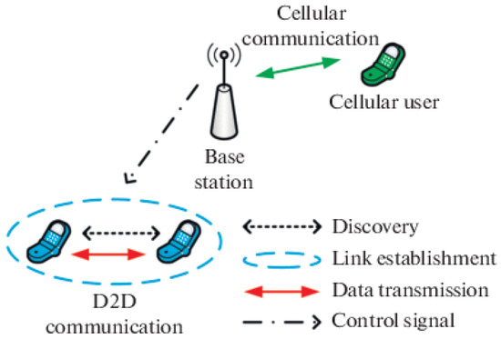 Resource allocation for D2D communications in wireless networks (Green arrow represents the communication channel).