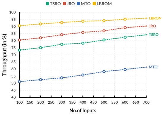 Figure 4 shows the comparison of throughput between the existing and proposed models. In a comparison range, the existing traffic-shifting-based resource optimization (TSRO) obtains 78.24%, joint resource optimization (JRO) reaches 85.85%, multirate throughput optimization (MTO) reaches 55.78% throughput, and the proposed load-based resource optimization model (LBROM) achieves 93.74% throughput. Throughput in device-to-device communication can be calculated by dividing the amount of data successfully transferred in a certain period by the total amount of data that was attempted to be transferred at the same time. Generally, throughput is expressed in bits per second (bps).