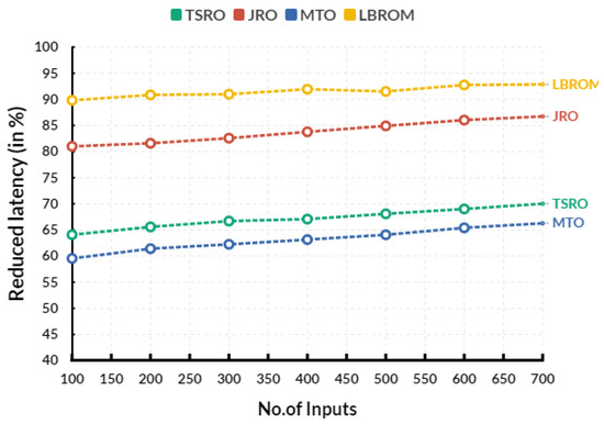 Figure 5 shows the comparison of reduced latency between the existing and proposed models. In a comparison range, the existing traffic-shifting-based resource optimization (TSRO) obtains 67.08%, joint resource optimization (JRO) reaches 83.78%, multirate throughput optimization (MTO) reaches 63.16% reduced latency, and the proposed load-based resource optimization model (LBROM) achieves 91.94% reduced latency. In device-to-device communication network, this refers to the amount of time needed for data to travel through a network from one device to another. It is measured in milliseconds (ms), which is one-thousandth of a second. Reducing latency can significantly improve network performance, allowing for faster data transfer between devices and more efficient communication.