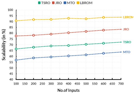 Figure 6 shows the comparison of scalability between the existing and proposed models. In a comparison range, the existing traffic-shifting-based resource optimization (TSRO) obtains 69.38%, joint resource optimization (JRO) reaches 80.38%, multirate throughput optimization (MTO) reaches 60.42% scalability, and the proposed load-based resource optimization model (LBROM) achieves 92.85% scalability. Device-to-device communication networks are characterized by their scalability, which refers to the ability of the network to accommodate growth in the number of nodes or devices connected to it. Scalability is an important feature for any network, as it allows for a larger number of devices to communicate without reducing the network’s performance. This is especially important for networks that support a large number of devices, such as the Internet of Things (IoT). For a device-to-device communication network to be scalable, it must be able to accommodate an increase in the number of devices connected to it, while still providing the same level of performance. Table 3 provides the overall comparison between the existing and proposed models.