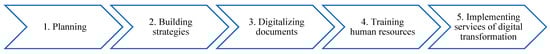 In [10], Swen and Reinhard thought that digital transformations integrate digital technology into business operations to change how business models fundamentally operate and provide new values to customers. It is a change in managing processes, procedures, and culture based on effective digital platforms and business targets. The current business industry is facing a significant challenge from the process of integration of the digital transition and the COVID-19 pandemic challenge going on globally. Transformation is an essential solution that helps businesses improve their competitiveness, increase labor productivity, make the business sustainable, and integrate with the global economy. That can be interpreted as using digital technology to create or modify business processes, cultures, and existing customer experiences to meet the requirements of market and business changes. The authors propose a five-step digital transformation process as shown in Figure 1 below.