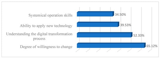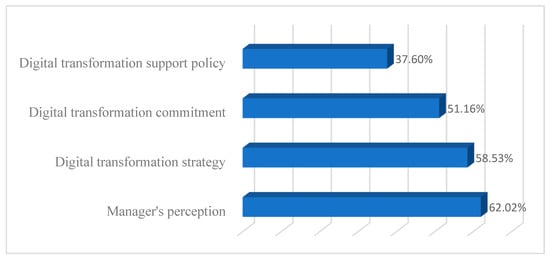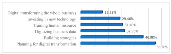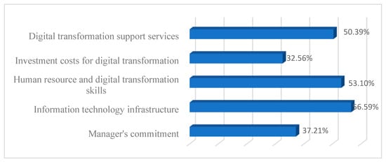 Figure 5 shows that 60.02% of managers recognized the importance of digital transformation. This activity must start from manager thinking to infrastructure construction, personnel training, and technology. The primary challenge in the digital transformation process is the mindset of leaders. They must understand that digital transformation is not just about purchasing software but a long-term, continuously innovative operation. Unfortunately, only 37.60% of managers have policies to support digital transformation.