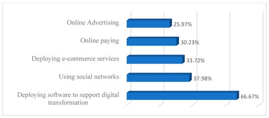 The survey results in the above table show that 66.67% of enterprises have deployed one or more software to support the logistics chain. About 30.23% of businesses have adopted electronic payment services, while the adoption rates are higher for e-commerce services (33.72%) and social networks (37.98%) (Figure 9). In contrast, online advertising has the lowest adoption rate at 25.97%. This may indicate that businesses focus more on improving their payment processes and expanding their online sales channels rather than investing in e-advertising to reach more customers. The application of digital technology, IT devices, automation lines, and automatic pickup trucks is still relatively small because this field needs more research and investment.