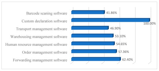 Statistical results show that 53.1% have an application of a warehouse management system, 46.90% have a transportation management application, and 41.86% use barcode technology (Figure 10). Although 99% of transport vehicles have cruise monitoring equipment, 100% of enterprises declare customs. Only large enterprises such as Tan Cang, Gemadept, Vinafco, U&I, TBS, Transimex, and Sotrans have enough resources to develop ERP software to achieve data synchronization between delivery, inventory management, and financial accounting departments.