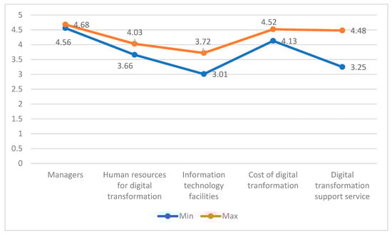The average maximum and minimum values of factors affecting digital transformation activities of logistics enterprises.