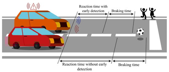 Illustration of a time-critical situation with and without proposed early detection chain. The braking times are identical. Reaction time can be reduced by using low-latency hardware processing (upper car). Reaction and braking times are not to scale; braking time is typically much longer.