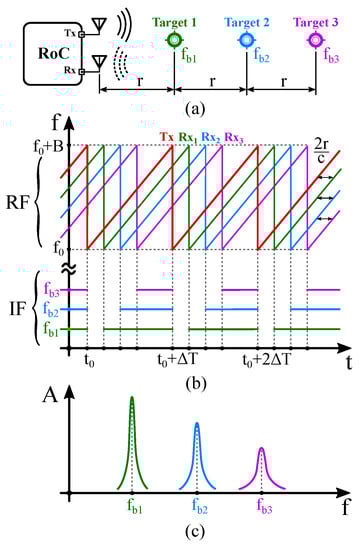 Illustrations showing the principle of distance estimation for a conventional FMCW automotive Radar-on-Chip (RoC): (a) equidistant spatial object positioning, (b) time-domain transmitted (TX) and received (RX1, RX2, and RX3) reflected up-chirps with the corresponding mixing products (, , and ), and (c) the magnitude spectrum of intermediate-frequency signal.