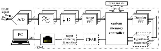 Figure 4 shows a typical radar back-end used for range-Doppler digital signal processing. Usually, data are acquired from an array of ADCs (one ADC per RX channel) and the raw ADC samples are filtered and down-sampled before FFT processing. Multiple parallel processing chains are used to enable real-time data throughput.
