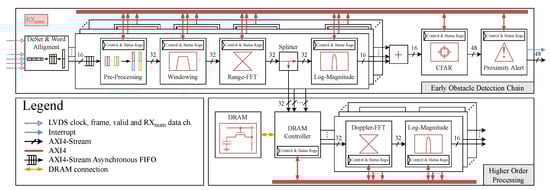 The proposed open-source hardware generator [] was developed with two objectives in mind. The first is that the generator instances should always be prepared to accept new data from the radar front-end. The second objective for the system is to detect obstacles as quickly as possible. For this purpose, the early obstacle detection chain was designed to work concurrently with higher-order processing chain and not to interfere with its operation. A block diagram of the proposed early obstacle detection chain and its connection to the higher-order processing chain (Doppler-FFT and beyond) is shown in Figure 5.