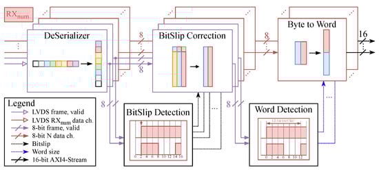 The clock domain crossing from this clock region to the DSP clock region (clock region of the pre-processing block and blocks that follow) is accomplished using AXI4-Stream asynchronous FIFOs. The depth of the used FIFOs is four, and this value has been used for calculation of the worst-case FIFO latency. The block’s overall latency is eight clock periods, four for the deserializer and word detection block and the rest for the asynchronous FIFO.