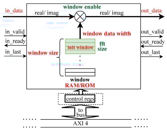 Windowing is used prior to performing an FFT to mitigate the spectral leakage presentable inside the frequency spectrum. A design diagram of the windowing block, showing the input/output signals, the parameters of the module, as well as the control registers, is depicted in Figure 7. The windowing operation is performed by continuous multiplication of the input samples with windowing coefficients.
