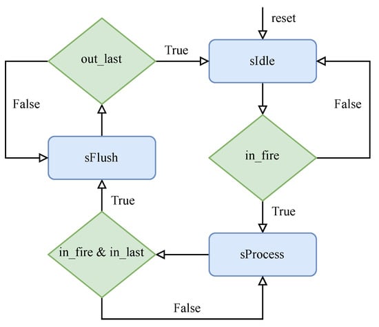A simple finite state machine (FSM) that controls the data flow of the used SDF-FFT processor is given in Figure 9. In the FSM diagram, some of the signals are omitted for clarity but a brief explanation of each state is as follows: sIdle is a reset state and some register initializations are carried out in this state. The system stays in the sIdle state until the signal in_fire (in_ready && in_valid) from the input side is not asserted. Data processing is performed in the sProcess state and when in_fire is not active, the system stays in this state but the counters predetermined for stage control are frozen. A transition from the sProcess to the sFlush state happens if in_last and in_fire signals are activated. In the sFlush state, data flushing is active. Once out_last (indicating the last sample in the output stream) is asserted, FSM transits to the sIdle state.