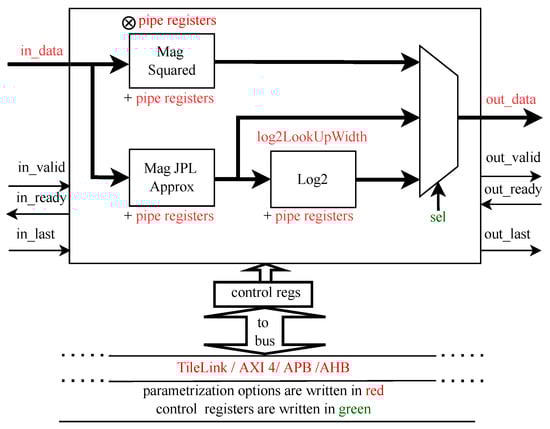 A fully streaming computation of the input complex sample magnitude, i.e., the absolute value, is performed by the logarithm-magnitude multiplexer (LogMagMux) block, depicted in Figure 10. Additionally, the squared magnitude and logarithm for the base 2 () of the absolute value of a complex input value is also supported.