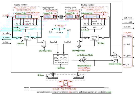 Block diagram of the CFAR design generator showing input and output signals as well as the versatile internal organization with plentiful available design parameters and control registers. Control registers are shown in green; parametrized options are written in red.