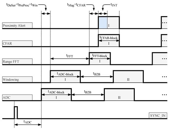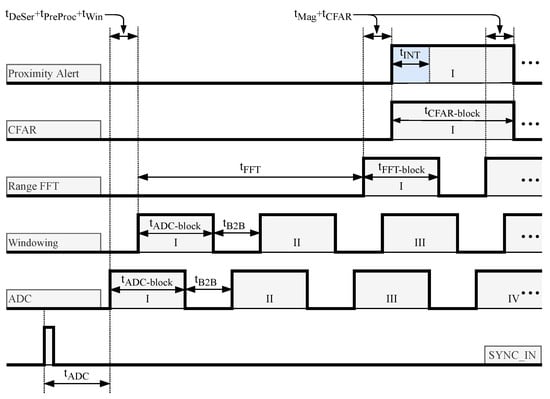 To simplify the diagrams, the deserialization and word alignment block, as well as the pre-processing block, were omitted because they are ADC data diagram replicas that have been shifted in time by their respective latencies. The same was carried out for the LogMagMux block, which is the time-shifted replica of the range-FFT data diagram. Considering all the previously calculated latencies for the each block in the early obstacle detection chain, a minimal system latency that depends on both the front-end radar configuration and the proposed system generator parameters is calculated.