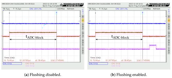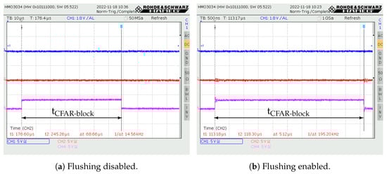 The time between the positive edge of the signal S_IN to the negative edge of the same signal is equal to the data block duration at the input of the pre-processing block. The expected duration of the is given by (9). The measured values are shown in Figure 17a,b when flushing is inactive and when it is active, respectively.