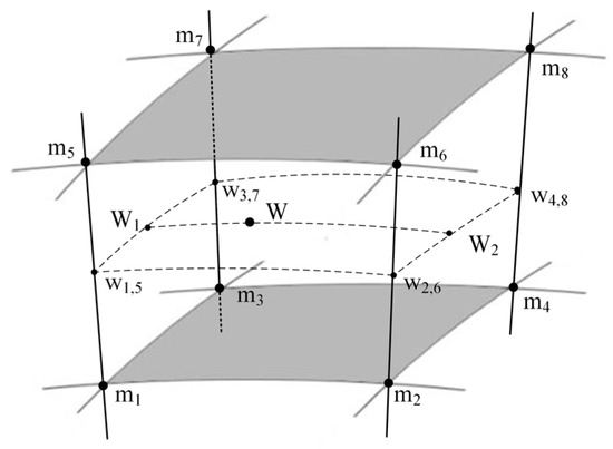 The longitude, latitude, and geopotential height of the calculated point and the grid point are compared to determine the relative position relationship between the calculated point and the grid. When the calculation point of meteorological data is inside the discrete grid, as shown in Figure 3, firstly, eight neighboring grid points are determined by calculating the longitude, latitude, and potential height of the point, and four groups of opposite grid points () with the same latitude and longitude are interpolated to the calculation point in the vertical direction. Temperature and specific humidity are weighted by a power inverse distance. The air pressure is interpolated using an exponential model. The method for calculating the weighted interpolation of the inverse power distance of the first degree is as follows.