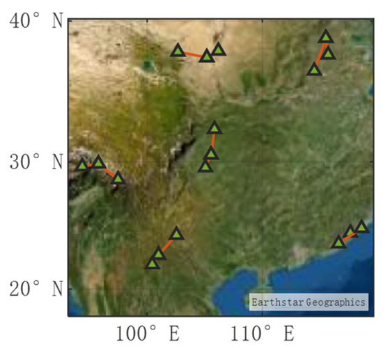 In order to analyze the effects of different geographical regions and climatic environments on the propagation delay, six typical regions in China, including Tibetan Plateau, North China Plain, Sichuan Hills, Yunnan–guizhou Mountains, Longmeng Desert, and Southeast Coast, were selected to calculate and analyze the propagation delay using the method presented in this paper. Two scattered links of 100 km and 200 km were set in each of the six regions. The location distribution of the links is shown in Figure 4, and the location parameters are shown in Table 1. We assume that the height of transceiver antennas of all links is 6 m, and we ignore the beam elevation caused by relief of terrain. Meanwhile, we assume that the transceiver elevation angle and transceiver obstacle angle of antennas are 0°. We select the county-level meteorological bureau within the specified areas as the transceiver address of the scattered antenna. In total, 16,488 h of ERA5 data was selected from 00:00 on 1 January 2020 to 23:00 on 28 December 2021.