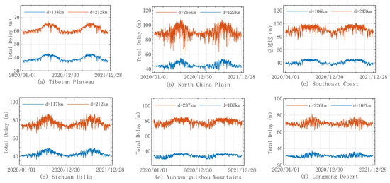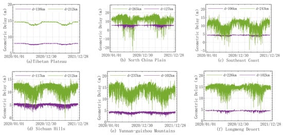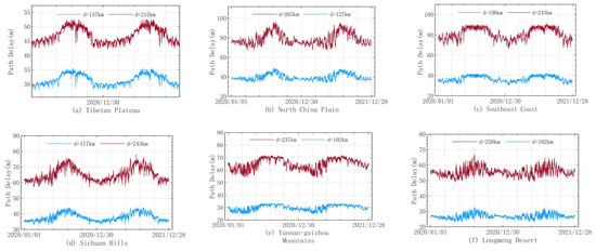 In terms of seasonal variation, the scattered links of different distances and regions showed obvious seasonal variation characteristics. The atmosphere is dry in winter and humid in summer. The path delay was lower in winter and higher in summer. The fluctuation amplitude of winter and summer was related to distance. The farther the distance, the greater the fluctuation amplitude. The geometric delay was higher in winter and lower in summer, which was opposite to the path delay, but the relationship between the size of the delay, the amplitude of fluctuation, and link distance is the same as that of path delay. The farther the distance, the larger the delay and its seasonal fluctuation. Geometric delay and path delay had opposite seasonal variation rules, and the peaks and troughs were superimposed to cancel, but the path delay was larger than the geometric delay. Therefore, the seasonal variation rule of the total propagation delay was mainly low in winter and high in summer. The climatic characteristics of different geographical regions also affected the seasonal changes in the delay. The statistical results of seasonal fluctuations in different links are shown in Table 2. The Tibetan Plateau and the Longmeng desert had the smallest seasonal fluctuations, and the variation in the seasonal fluctuations caused by the change in the propagation distance was relatively small. The seasonal fluctuations in the total propagation delay of 100 km were about 4 m. The Yunnan–guizhou Mountains and Sichuan Hills have the following seasonal fluctuations, which were about 5~6 m. The largest seasonal fluctuation of total transmission delay was about 7~8 m in the North China Plain and the Southeast Coast.