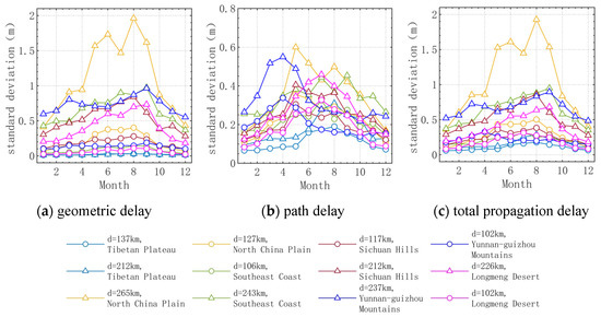 In terms of hour-by-hour variation, the difference processing is carried out on the delay results of 12 links, and the statistical characteristics of the data after the difference are calculated. The results show that hour-by-hour fluctuations obeyed the standard normal distribution with a mean of 0, but the standard deviations of the fluctuations in different links are different. Figure 8 shows the variation in the standard deviation of different links in different months of the year. It can be seen from Figure 8a that the hourly fluctuation standard deviation of the geometric delay has three characteristics. Firstly, the size of the standard deviation is related to the season, and the standard deviation in summer is higher than that in winter. Secondly, the standard deviation is correlated with distance. The farther the distance is, the higher the standard deviation will be. The standard deviation is generally within 0.5 m at a distance of 100 km. Thirdly, the standard deviation is related to geographic regions, and the standard deviation of different regions is different to some extent. Among them, the geometric delay standard deviation of the Tibetan Plateau is much smaller than that of other regions, and the change in distance has little influence on the standard deviation value; the standard deviation of 100 km and 200 km is about 0.02 m. The hourly fluctuation standard deviation of the North China Plain in different seasons is the biggest difference, and the difference between summer and winter can reach 1.5 m. In Figure 8b, the hourly fluctuation standard deviation in path delay also presents a trend of higher in summer and lower in winter. However, compared with geometric delay, the standard deviation of path delay is relatively small on the whole. The standard deviation of different regions ranges from 0.1 to 0.6 m, and the influence of the distance change on standard deviation is also relatively small. The total propagation delay is the sum of geometric delay and path delay, and the standard deviation of geometric delay is greater than the path delay. Therefore, the hourly fluctuation in the total propagation delay is dominated by the geometric delay.