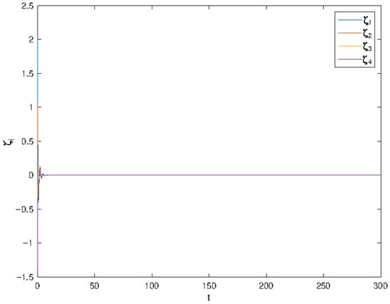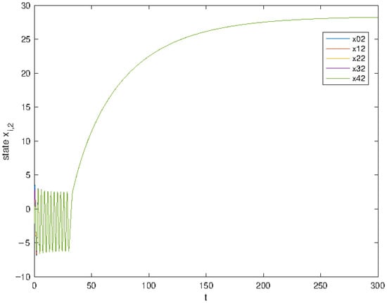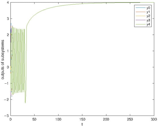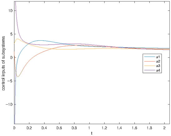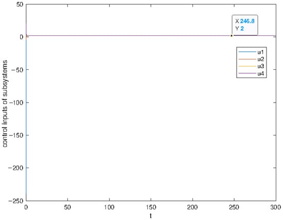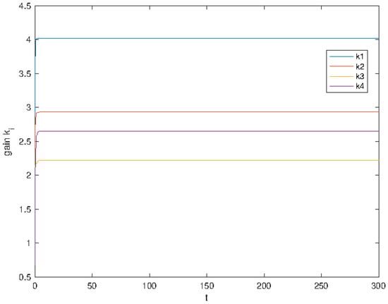 The simulation results of the subsystems’ outputs and states are shown in Figure 1, Figure 2, Figure 3 and Figure 4 and show the adaptive gains and the tracking errors. It can be seen that both the output and the states, which are shown in Figure 1 and Figure 2, respectively, converge to the reference signal trajectory with the values . Figure 3 shows that the adaptive gains are bounded; the tracking errors are shown in Figure 4. The control inputs are shown in Figure 5 and a specific control input is shown in Figure 6. It is also noted that the trajectories are different after 30 s in the simulation, due to the change in the value of d.