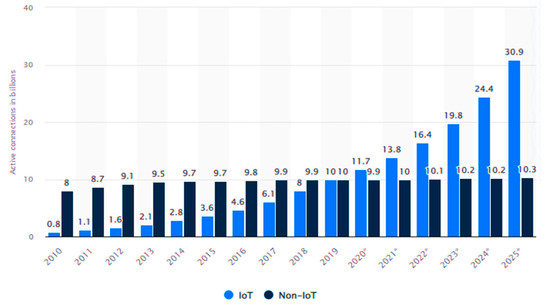 - Vailshery, L.S. Internet of Things (IoT) and Non-IoT Active Device Connections Worldwide from 2010 to 2025 (In Billions). Available online: https://www.statista.com/statistics/1101442/iot-number-of-connected-devices-worldwide/#:~:text=IoT%20and%20non%2DIoT%20connections%20worldwide%202010%2D2025&text=The%20total%20installed%20base%20of,that%20are%20expected%20in%202021 (accessed on 9 July 2022).