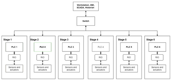 SWaT is an operational water treatment testbed that can produce 5 US gallons of filtered water per hour. The testbed is a scale-down setup of large modern water treatment plants common in large cities, with a footprint of about 90 square meters. The control system and overall physical process of SWaT intimately reflect the legitimate setup in the field. Figure 3 shows that there are six stages of the SWaT, numbered P1 to P6. At each stage, there are dual PLCs one of which acts as the primary controller, if the primary PLC fails, the secondary PLC works as a backup of the event. In general, the testbed uses a dispersed control strategy in regular operations, with local PLCs controlling each stage of the process separately. The PLCs are connected in the layer 1 network and communicate constantly to receive the state information from other processes that the local device needs for some of the processing steps. The operator can control all the actuators in the testbed manually, instead of using the automatic distributed control mode, by using the human–machine interface (HMI) and supervisory control and data acquisition system (SCADA) systems.