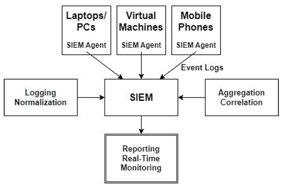 Since IoT devices are now being used in every field from homes and small-scale retail shops to large-scale industries, the vulnerabilities within them are exploited by adversaries to steal information or for ransom. Gartner in 2005 introduced SIEM (security information and event management) for endpoint monitoring. SIEM is the combination of SIM (security information management) and SEM (security event management), which are two separate systems for event storage, analysis, and reporting (SIM) and real-time collection of events (SEM) [25]. Generally, SIEM is a security tool that aids companies in identifying potential security vulnerabilities and threats before they manage to interfere with and damage business operations. For security and compliance management use cases, it surfaces user behavior anomalies and employs artificial intelligence to automate many of the manual operations related to threat identification and incident response. It has become a mainstay in contemporary security operation centers (SOCs) [26]. Security information and event management (SIEM) tools are typically used for cyber-physical systems security. They collect the event logs from the devices and perform diverse actions to ensure the security of the connected systems. The main functions of SIEM solutions are event logging, normalization, aggregation, and event correlation. In logging, the SIEM solution stores the data collected and forwarded by the agents on the devices. These data collected from different types of devices are then converted to the common format so that the data structure operations can be performed on them. This process is called normalization. After normalization, all the redundant values from the data are eliminated (aggregation). Then, the processed logs are correlated for the detection of any suspicious behavior and unknown pattern. After performing all the functions on the collected data, SIEM solutions generate alerts in case of any abnormal activity performed on the devices. A basic SIEM architecture is shown in Figure 4.