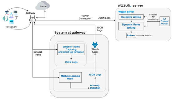 In [13], the authors introduced a fog network distributed over the smart city which detects and alerts unusual activities and IoT cyberattacks. Data from the IoT devices was collected through the IoT sensors in the IoT layer and computed at the fog layer, and then an alert was generated to notify the cloud security systems. The fog layer strategy is useful for reducing the latency between IoT sensors and the cloud. At the fog layer, the machine learning algorithm, random forest, was trained on the UNSW-NB15 dataset [14] with the selected features such as source and destination IP, destination port, protocol, and duration. In another research [15], researchers presented the SIEM-based IoT-botnet attack detection and mitigation framework. Traffic logs from the IoT devices were collected through the gateway by installing the Splunk SIEM agent on it. This forwarding agent sent the traffic logs after parsing and indexing them to the Splunk Enterprise server. These forwarded logs were analyzed, and if the distributed denial of service (DDoS) attack was identified, the Splunk SIEM server built the connection with the gateway using SSH and automatically added the rules to the firewall IPTABLES to stop the malicious traffic and alert the network administrator about the attack.