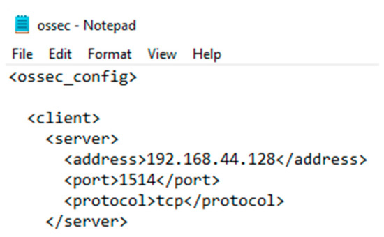In this research, the gateway agent is configured with the server through the Wazuh server’s IP setting in the agent’s configuration file. The agent requests for the authentication key from the server on the server’s IP and the server responds and the connection is established for monitoring. The Wazuh server receives the logs from the agent on port 1514 which is also defined in the configuration file ossec.config of the agent, as shown in Figure 7.