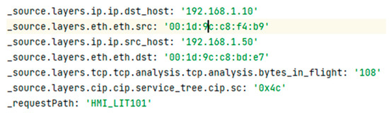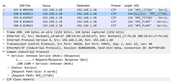 For SWaT process monitoring, the features of the common industrial protocol are deeply analyzed, extracted, and compared in the rules for the event alert generation. The CIP protocol has the service codes in the packets that have the fixed value for read (0x4c) and write (0x4d) commands. The example packets of the read operation are stated in Figure 8 and Figure 9. PLC 6 (192.168.1.60) requests the value of level sensor LIT101 from PLC 1(192.168.1.10), which is equipped in the first stage of the SWaT system. PLC 1 responds back with success status to PLC 6 with the sensors’ data.