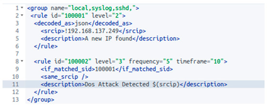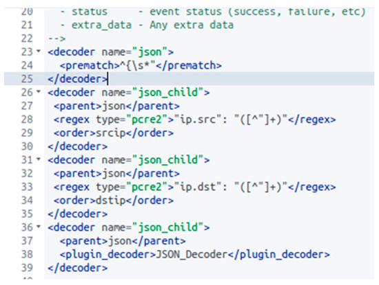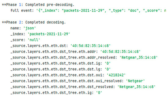 As the Wazuh agent can only read the flat log files, the JSON logs in the out.json files were converted to the inline JSON format. In this research, the logs converted from raw pcap to the JSON format had one packet in multiple lines which without using the xPath filters could not be read by the agent [27]. Using a Python script, the multiline JSON logs were converted to inline JSON logs, i.e., one log per line.