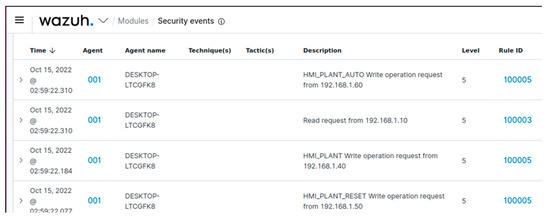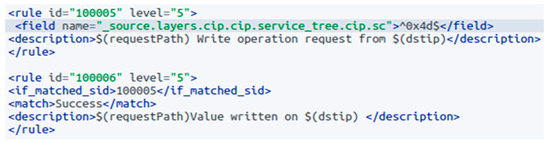 CIP has two types of messages: explicit and implicit messages. Explicit messages contain the attributes, service codes, and paths that are used to direct the devices on what action to perform. The implicit messages are used for I/O data transportation. There are no addresses, or service codes and the device already know what to do with the data implied by the connection ID that is decided at the time of connection. Event monitoring in the industrial networks that use the CIP protocol can be monitored using the CIP attributes. The Secure Water Treatment (SWaT) setup also uses the CIP protocol. After analyzing the network traffic of SWaT, service codes, request path, and success status were recognized as the important features for event monitoring of SWaT. Important fields of CIP that were used in the rule for threat intelligence at the Wazuh server end are service_code, request_path, and success_status.
