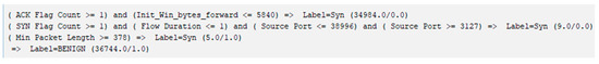 The next step was to monitor the traffic using machine learning models for the detection of state-of-the-art attacks in IIoT devices. The machine learning models were trained on the CICDDOS2019 dataset which was available in CSV format. In this dataset, the researchers collected the data into pcap files from the network gateway by using CICFlowMeter, the traffic was converted into the CSV having the network traffic flow features. The pre-processing of the dataset was performed before training the models. The field’s source and destination IP addresses, timestamps, and flowID were to be encoded before feeding the dataset to the model. Using the information gain technique, important features that correlated with each other were identified and the resultant (encoded and compacted features) dataset was set ready to train the models. The dataset was split as 70% for training the model and 30% for testing the models. The training data files were used to train the DT, RF, and KNN machine-learning classification models, widely used for classification problems. The dataset had different class labels, i.e., benign and the types of DDoS attacks such as UDP flooding, SYN flooding, NetBIOS, and LDAP, to name a few. The scripts for model training and testing were written in Python using the PyCharm community version. The accuracy of all the models to predict the attacks were calculated on the incorporated dataset and the best predictive model with higher performance measures was used for the prediction of attack and benign traffic logs. The following sections are on the model’s description and its results on the CICDDoS2019 dataset.