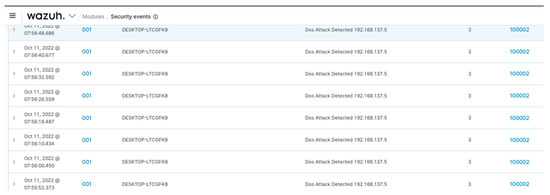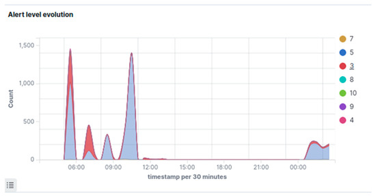 The Wazuh indexer performed analytics functions on the logs, correlated them, and generated the summary graphs on the dashboard according to the level of alerts, as shown in Figure 19.