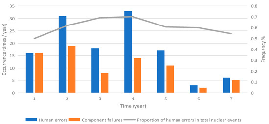 After the Three Mile Island (TMI) accident, the nuclear industry has been committed to reducing the load and human error of operators by various means, such as improving the automation level of NPPs, improving human-machine interfaces (HMI) and operating procedures, developing operator support systems (OSS), enhancing operator training, etc. [16]. After these efforts, the number of human errors caused by operators in normal operations has decreased year by year. However, the prevention of human error in unfamiliar conditions is still one of the types of research focuses [17]. One of the lessons learned from three serious nuclear accidents (namely, the Three Mile Island nuclear accident, the Chornobyl nuclear accident, and the Fukushima nuclear accident) is that the probability of operator human errors in completely unfamiliar environments will significantly increase [18]. According to the statistics of the incidents in the first seven years of operation of six new NPPs in China (as shown in Figure 1), it is found that although the total number of incidents has fluctuated in the first four years, the proportion of human error has increased year by year. In the following three years, the proportion of human error and the number of incidents showed a slow downward trend. This trend change is related to the operator’s unfamiliarity with the NPPs, unskilled operation, and the running-in with the NPPs at the initial stage of plant operation. Therefore, it is necessary and urgent to strengthen the supervision of operators in unfamiliar plant operating conditions.