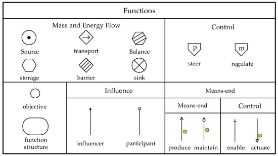 How to identify the success paths by utilizing the available functions to achieve the operational objectives is a key issue of NoP-OST. This paper adopts a Flow-based functional modeling approach [27] to describe the relationship between available functions and operational objectives. Flow-based approaches model a system by focusing on the flows (of mass, energy, or information) in the system and on the component actions on the considered flows [28]. In the NoP-OST, Multilevel Flow Modeling (MFM) is selected to build various system models of NPP. As shown in Figure 3, MFM provides common basic functions, such as source, sink, transport, barrier, storage, and balance, for representing mass, energy, and information [29]. Instances of these functions are connected to build function structures (i.e., flow structures). Functions can be linked to objectives (i.e., purposes of the system) by means-ends relations, representing that a set of functions are used to achieve the objectives. An objective can be also linked to functions, representing that the objective must be fulfilled for the functions to be available. The latest development of MFM provides control functions [30]. MFM has been usually applied as a cause-consequence reasoning technique for the purposes of fault diagnosis or alarm analysis of process systems including NPP, where the means-ends analysis strategy is commonly used. Starting from the objectives and through a top-down and backward-searching approach, the causal paths that endanger the achievement of the objectives in an MFM model are identified [31,32,33,34]. The application of MFM also serves for hazard analysis, which adopts a forward analysis method. The impact of an abnormal function on the objectives is analyzed and reasoned by utilizing a bottom-up and forward reasoning approach [35]. Yang [36] presents a method of utilizing MFM for quantitative reliability analysis. Song [37] proposed an MFM-based operation search method for planning the operation of complex process units. Recently, a model and rule-based operational process synthesis (OPS) system is proposed from the perspective of functional state transition [38].