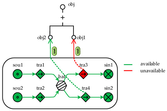 The principle of success path identification based on MFM models is illustrated in Figure 4. The model shown in Figure 4 is a hypothetical MFM model that is not specific to specific objects. In this model, the system objective (obj) is realized by a flow structure composed of two sources (sou1 and sou2), two sinks (sin1 and sin2), and four transport functions (tra1, tra2, tra3, and tra4). It is further assumed that the objective obj is achieved by either sub-objective obj1 or obj2 which are directly implemented by the functions tra3 and tra4, respectively.