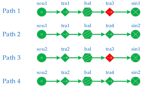 The success path identification starts from each source function and is analyzed forward along the flow direction. If the current path (the smallest one consists of one source function) has an available downstream function (except for storage and balance functions), the current path and downstream functions are connected to form a new path. Repeat this process repeatedly until the path reaches a sink function, thus forming a complete path from the source function to the sink function. If the downstream function of the current path is a storage or balance function (these two types of MFM functions can have multiple outputs), connect the storage or balance function to the current path, and copy the new path according to the output number of the storage or balance function, so that each new path corresponds to the output of the storage or balance function. Figure 5 shows the four complete paths of the MFM model shown in Figure 4 identified by this method. Among them, both path 1 and path 3 contain the unavailable tra3. Therefore, these two paths are not success paths unless tra3 can be recovered, and paths 2 and 4 are success paths.