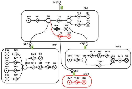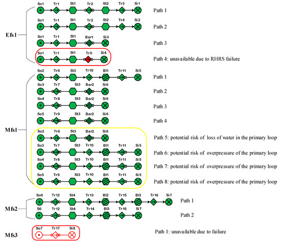 By using the method proposed in Section 2.2, the MFM model shown in Figure 7 is analyzed, and the successful paths are shown in Figure 8. As shown in Figure 8, the energy flow Efs1 contains 4 paths, and the mass flow Mfs1, Mfs2, and Mfs3 contain paths 8, 2, and 1, respectively. The physical meaning of each path is shown in Table 3. According to the assumption, the path corresponding to Mfs3 is unavailable, which also leads to the unavailability of Tr5 and path 4 in the Efs1 (which contains the unavailable Tr5).