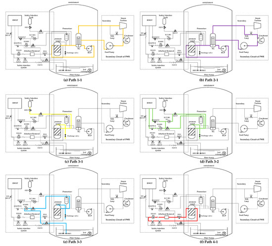 The success path 1-1 can well meet the demand for reactor core cooling and generate additional power supply. However, it should be noted that when the temperature of the primary loop becomes too low, the unsaturated steam generated in the SG may damage the turbine blades and reduce the life of the turbine. The success path 2-1 can well meet the cooling demand without additional negative effects. In the success paths 3-1, SIT stores low-temperature coolant. However, due to its limited volume, it is difficult for the SIT to provide cooling for a long time. As for the success path 3-2, although the RWST stores a considerable amount of coolant, it is still difficult to provide cooling for a long time. The success path 3.3 establishes a coolant circulation between the primary loop and the floor sump. The heat exchanger can be used for long-term cooling with the environment, so it can be used for long-term reactor core cooling. However, paths 3-1, 3-2 and 3-3 should not be selected unless necessary, because they may cause overpressure in the primary loop and damage the integrity of the primary loop.