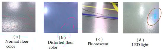 In order to avoid the extensive housekeeping work caused by the additional installation of hardware infrastructure in a factory, our system uses the factory’s existing aisle yellow sidelines as guiding lines for unmanned vehicles without adding any additional infrastructure. A camera in front of the unmanned vehicle captures the vehicle guidance line on the floor and analyzes the position of the guidance line for navigation control. The image recognition strategy of the unmanned vehicle system is based on the color recognition of each pixel. The pixels have red (R), green (G), and blue (B) values of between 0 and 255. The hue (H) value is between −180 and 180, the saturation (S) value is between 0 and 1, and the intensity (I) value is between 0 and 255 [32,33]. There is a lot of light interference in the factory, which causes the color of the pictures taken by the camera to be distorted. The floor color is distorted from gray to blue, as is shown in Figure 3.