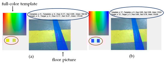 Figure 3a is a normal image of the floor, and the color of the floor in the picture is the same as the actual color. In Figure 3b, the floor in the image changes to a blue color. If we used a blue line as the vehicle guidance line, this may cause misjudgments. Figure 3c shows light interference caused by fluorescent lights. The yellow line becomes very bright due to the interference, and it cannot be correctly identified as a yellow line. In Figure 3d, the image is disturbed by the LED light of the instrument projected onto the floor. The color distortion causes great problems when it comes to image recognition. Using RGB color model recognition technology, we often cannot identify the floor or the guidance line accurately. Therefore, we used hue–saturation–intensity (HSI) color model technology [34]. HSI color model technology uses three components to represent color. The value of hue is between −180 and 180, the value of saturation is between 0 and 1, and the value of intensity is between 0 and 255, and this provides better distinctions between pixel colors [35,36,37]. In order to adapt to different factory environments, we designed a self-learning mechanism to analyze the required line color and obtain the parameters required by the system. This eliminates the need for manually testing the photos one by one and recording the hue–saturation–intensity value, reducing the required manpower and shortening the test time. Applying AI’s powerful machine learning (ML) [38,39] capabilities to hardware devices enables devices to perform analytics flexibly. ML can usually learn from past data and experiences to find the rules of its operation. In this case, ML involves color pattern training to recognize patterns using examples rather than programming with specific rules. It takes samples from the database to learn and create a hue–saturation–intensity rule for a set of colors and use it to make predictions. We use a full-color template image for the system to compare with the floor image, enabling the system to learn and record the values of the colors. The system automatically distinguishes colors and records related parameters, as shown in Figure 4.